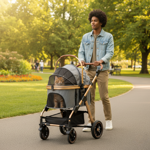 Poussette 3 en 1 pour chat avec cabine amovible. Conçue pour faciliter les déplacements, elle peut être utilisée comme poussette, panier de transport ou couchage pour votre animal.