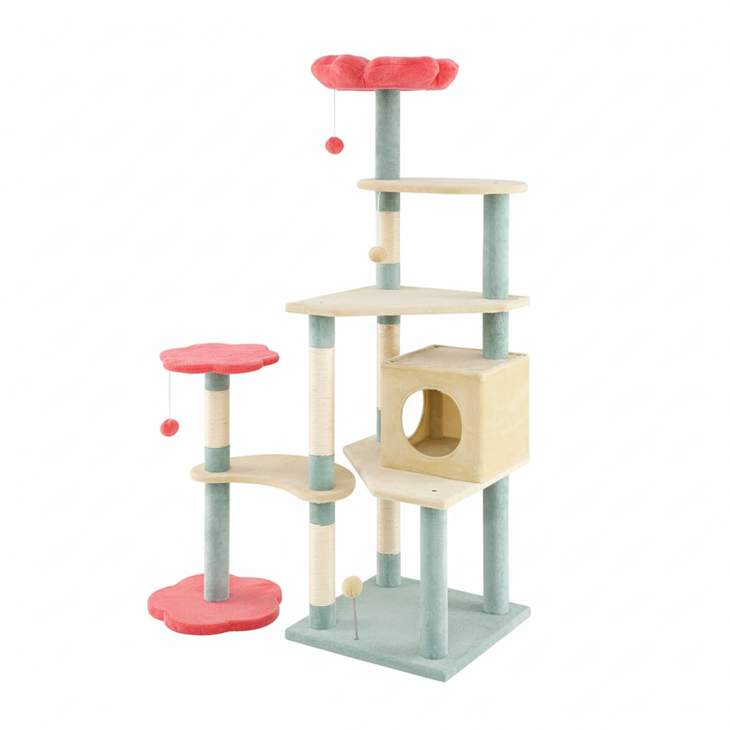 Arbre à chat floral multicolore, conçu pour offrir un espace de jeu, de repos et de grimpe.
