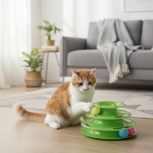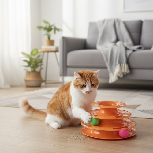 Jouet interactif à étages pour chat avec balles colorées. Conçu pour stimuler l’instinct de chasse, éveiller la curiosité et favoriser l’activité physique, il occupe votre chat tout en l’amusant.