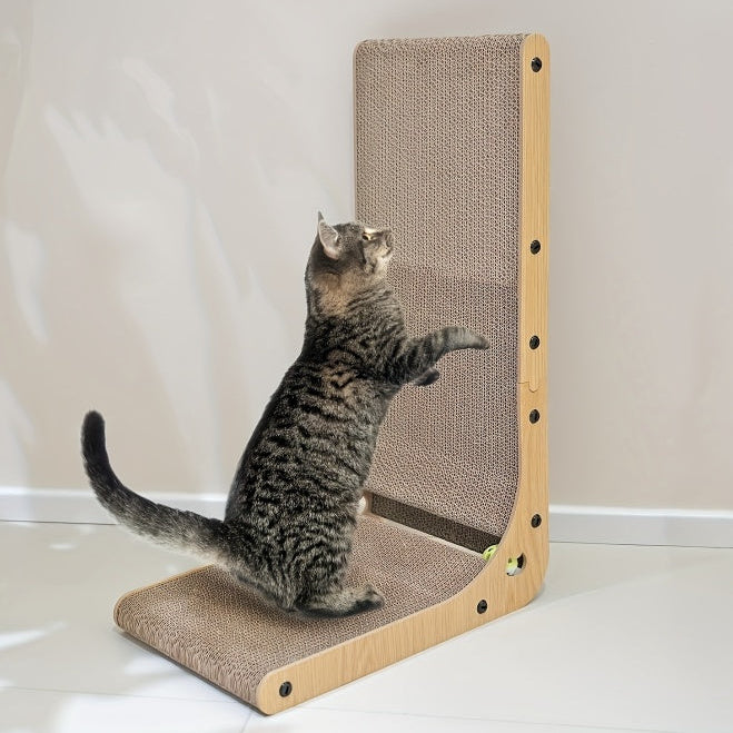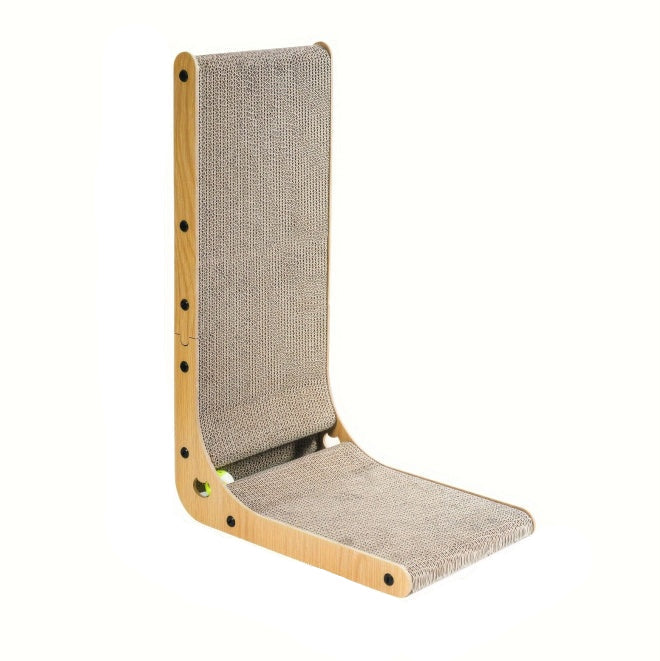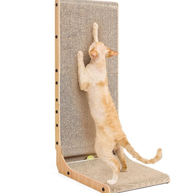 Grand griffoir en bois avec surface en carton ondulé, conçu pour protéger vos meubles et satisfaire l’instinct naturel de griffade de votre chat.
